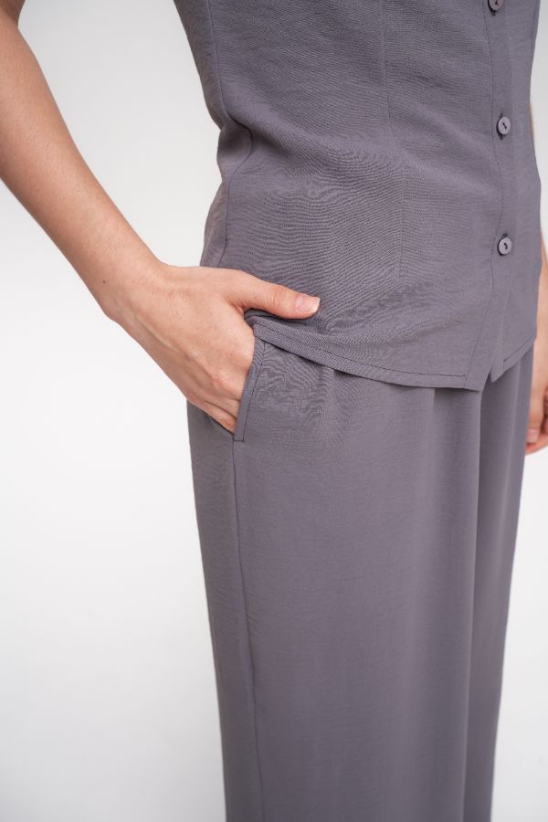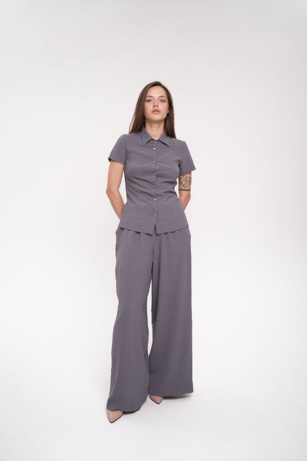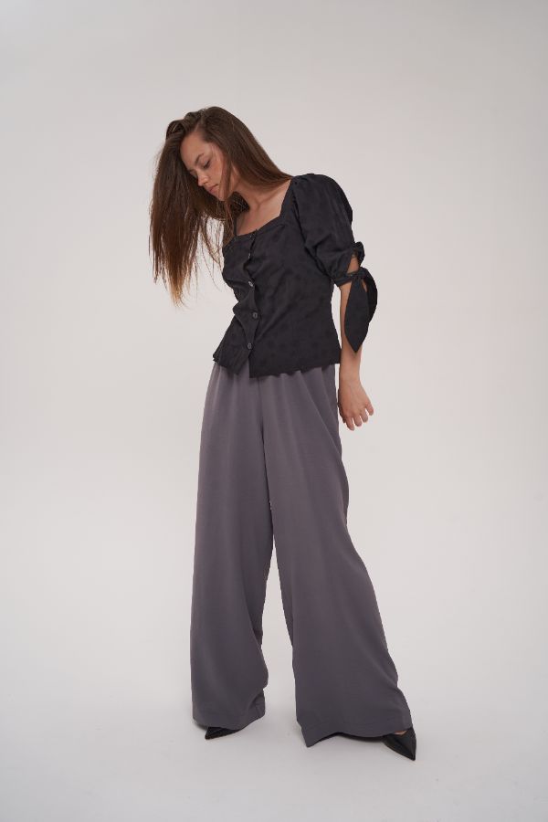 Блузка с квадратным воротом и брюки палаццо серые