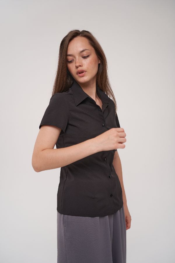 Блузка легкая, короткий рукав, с вытачками на полочках и на спинке, застежка на пуговицы. Цвет черный.