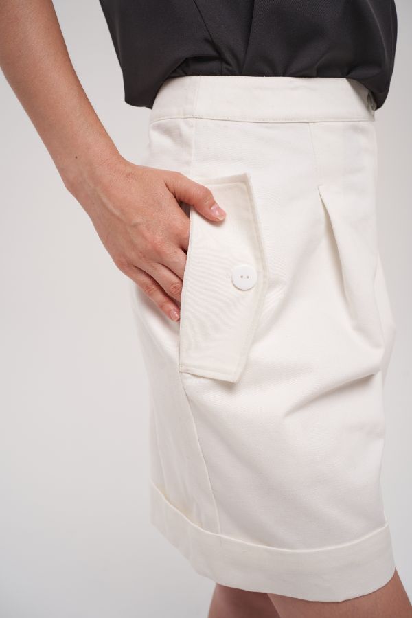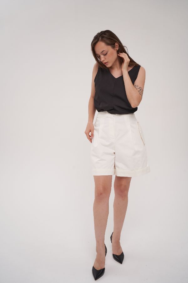 Шорты прямого силуэта, умеренного объема со складками. В боковых швах расположены карманы с клапанами. Застежка гульфик на молнию. Застежка пояса и клапанов карманов на пуговицы. Ткань: плотный 100% хлопок. Цвет молочный.