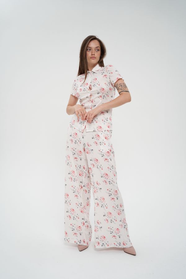 Брюки с широкими, свободно ниспадающими штанинами, которые расширяются от бедра. Карманы в боковых швах. Пояс на резинке. Цвет белый с цветочным принтом. Ткань: 100% хлопок.