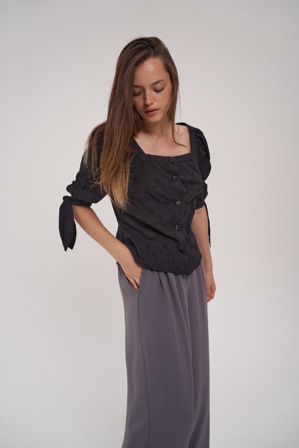 Блузка легкая свободная, рукав средней длины с завязками, ворот квадратной формы, с вытачками на полочках и на спинке, застежка на пуговицы. Цвет черный. Ткань: 100% хлопок.