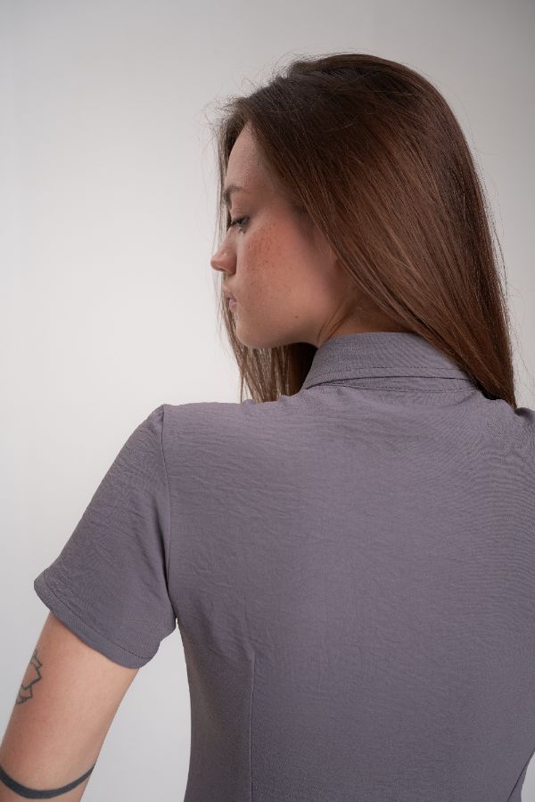 Блузка легкая короткий рукав, с вытачками на полочках и на спинке, застежка на пуговицы. Цвет серый. Ткань: 100% полиэстер.