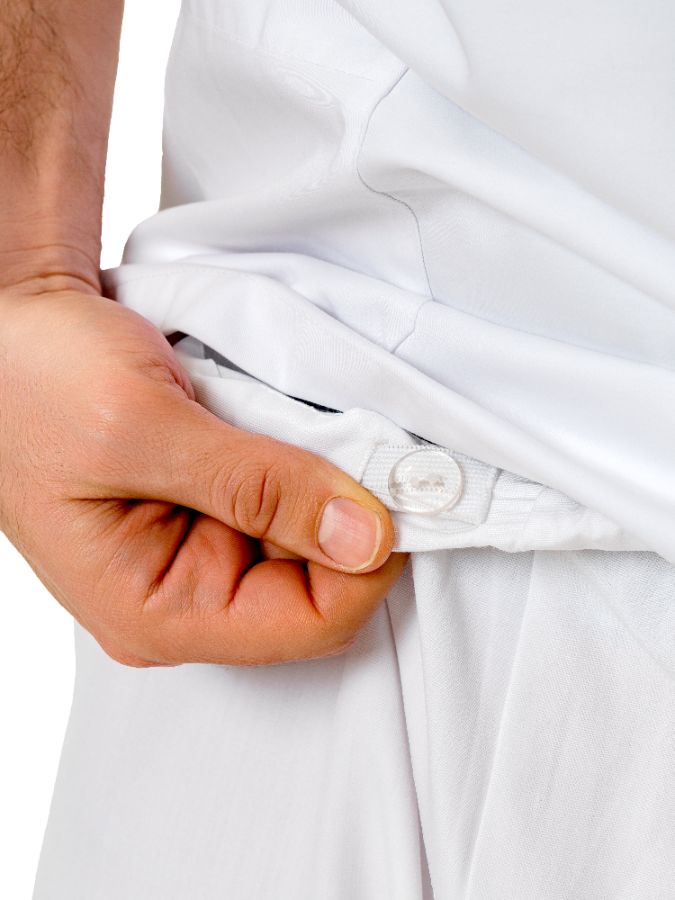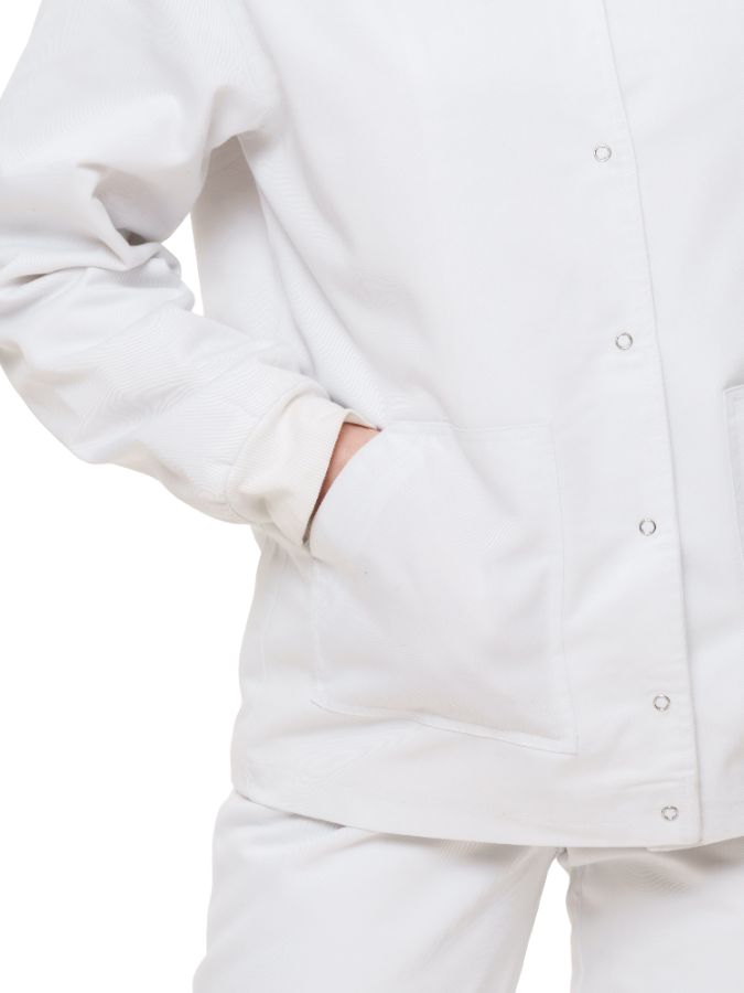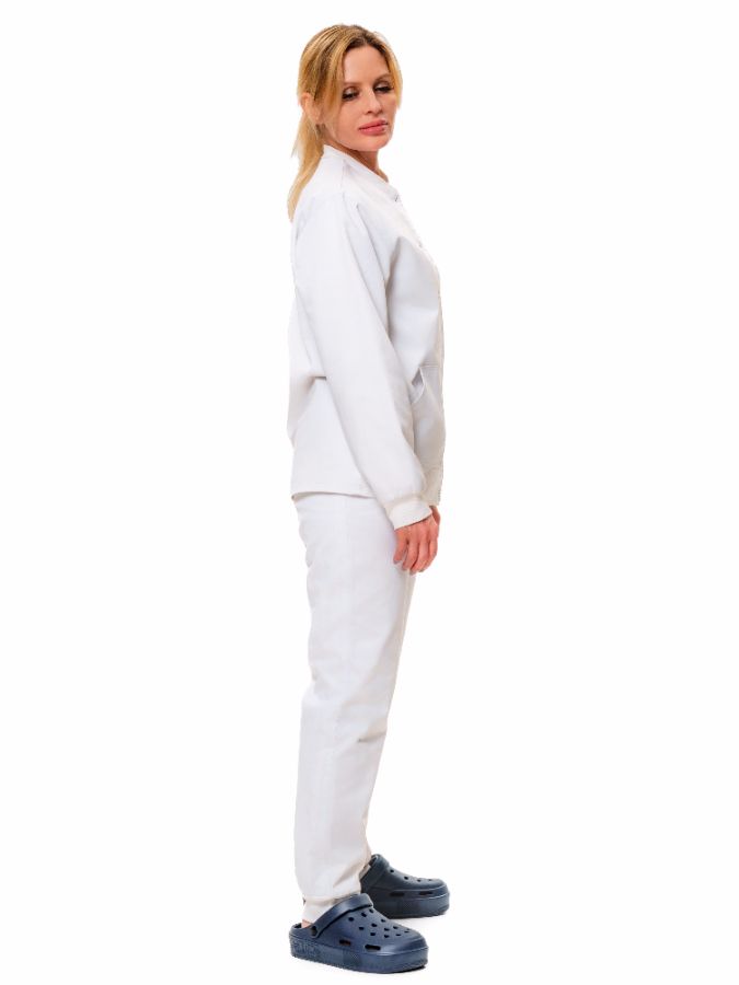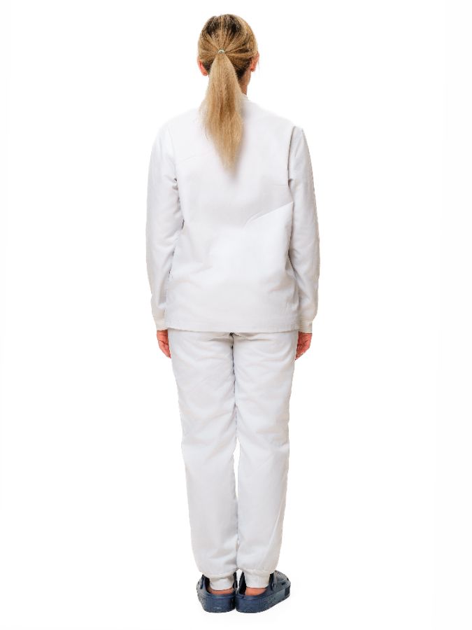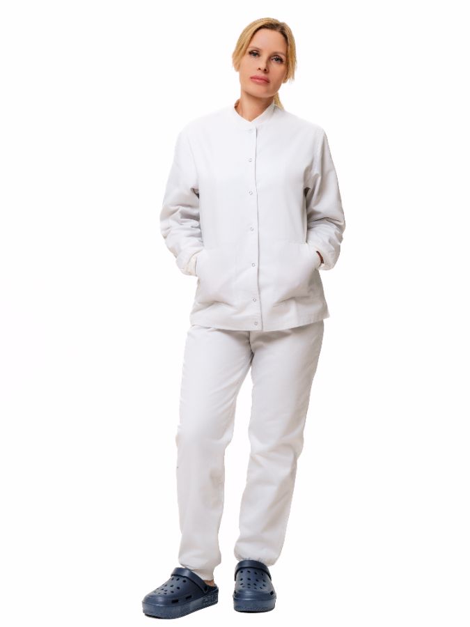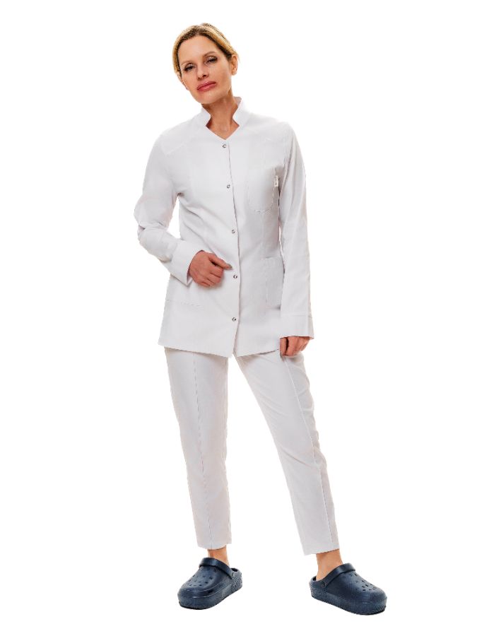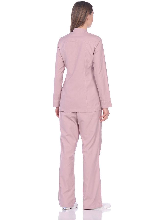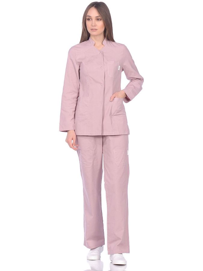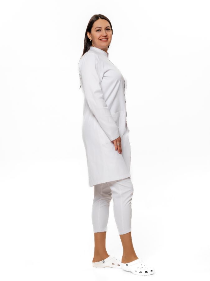 Халат короткий с застежкой по центру на кнопках, один нагрудный и два накладных боковых кармана. Брюки бананы с отстроченными стрелками, с поясом на резинке, с двумя боковыми карманами.