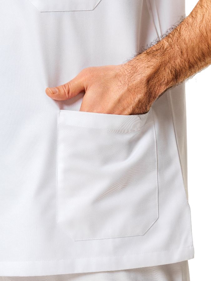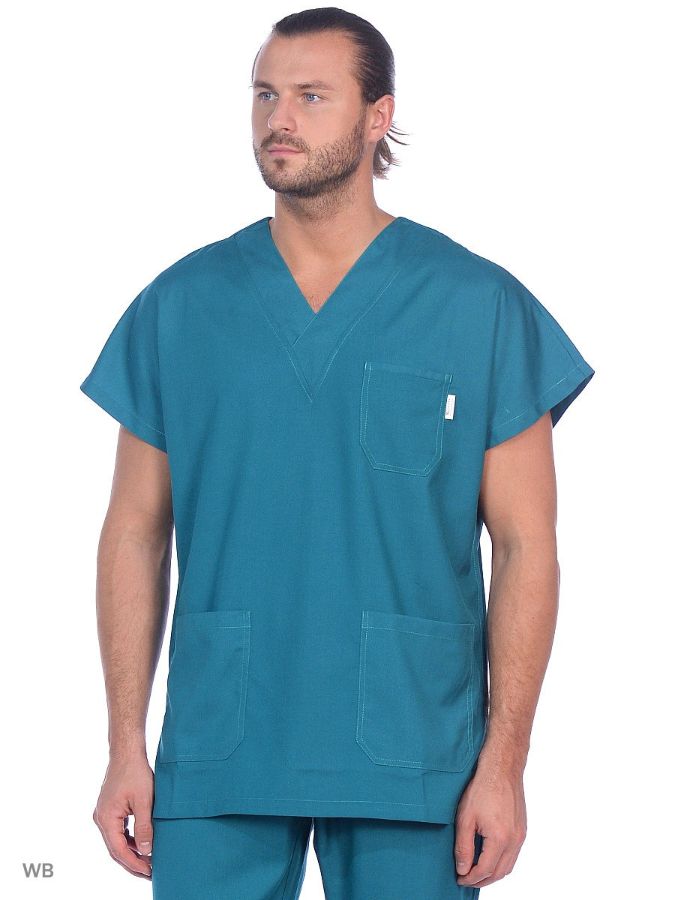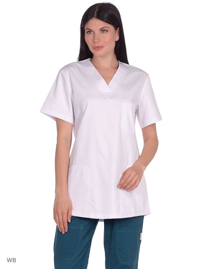 Туника с V-образным вырезом, одним нагрудным карманом и двумя боковыми накладными карманами.