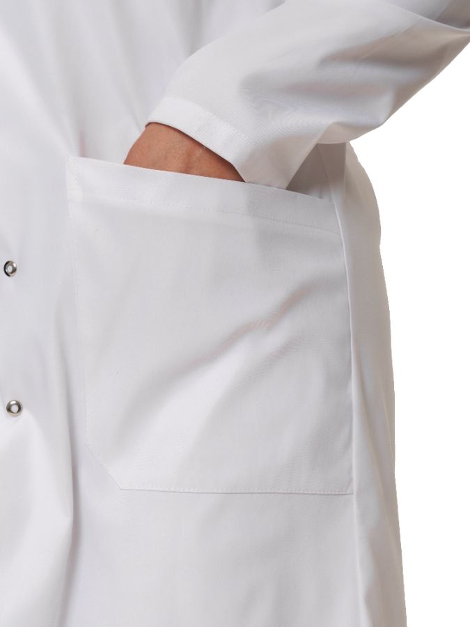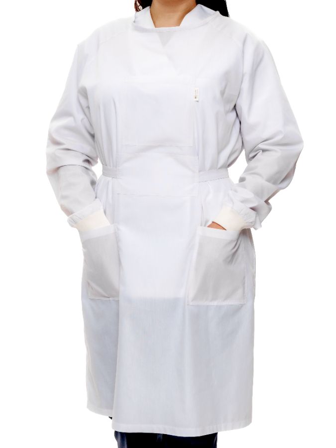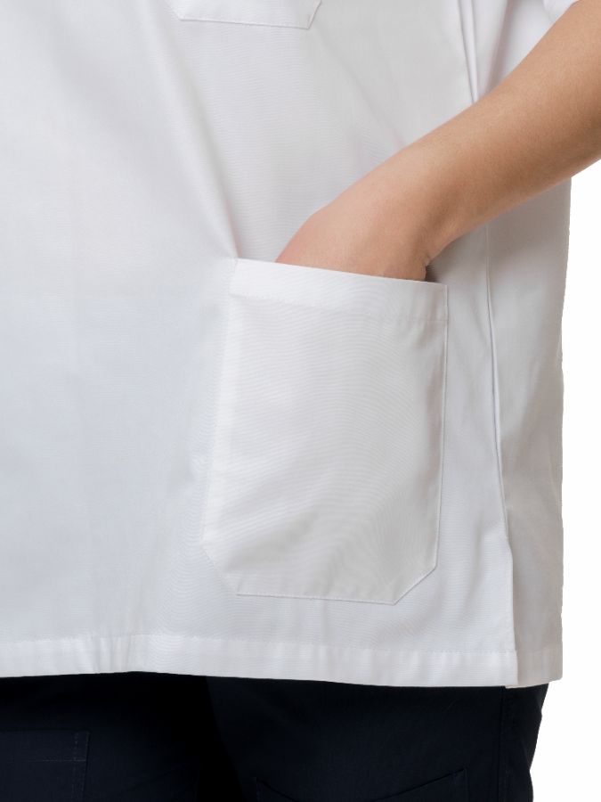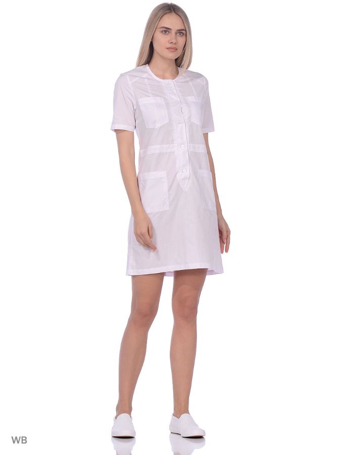Легкое платье для работы в теплых чистых помещениях. Центральная застежка на пуговицы. Два нагрудных кармана и два боковых кармана.